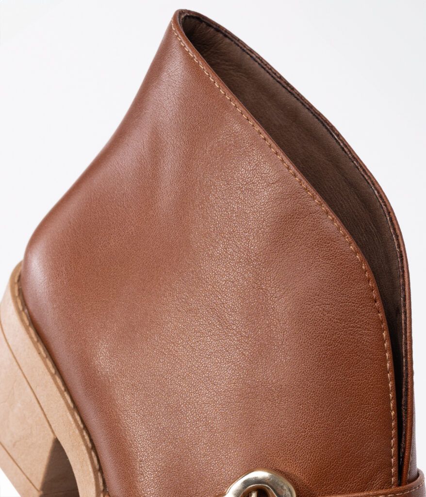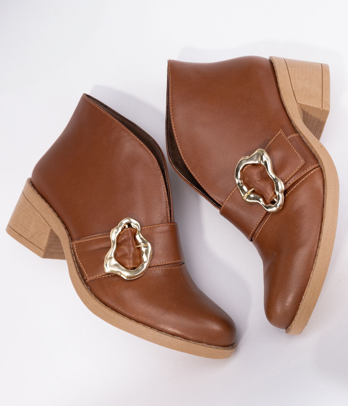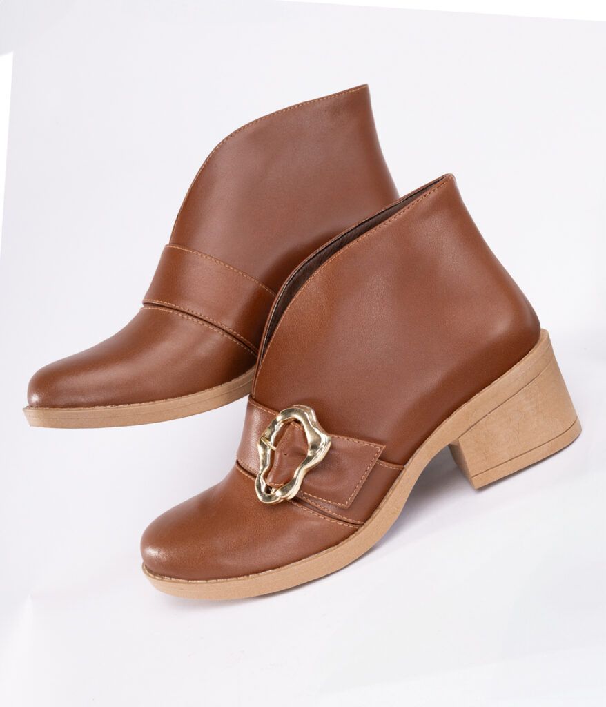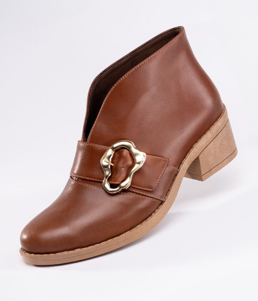 Este botín en cuero marrón presenta un diseño de caña baja con una apertura lateral que permite un movimiento natural y cómodo del pie. El detalle de la tira con hebilla dorada asegura un calce firme, mientras que su taco bloque de 4 cm ofrece la estabilidad necesaria para el uso diario. Su estructura está pensada para brindar seguridad en cada paso, manteniendo una silueta versátil y funcional.