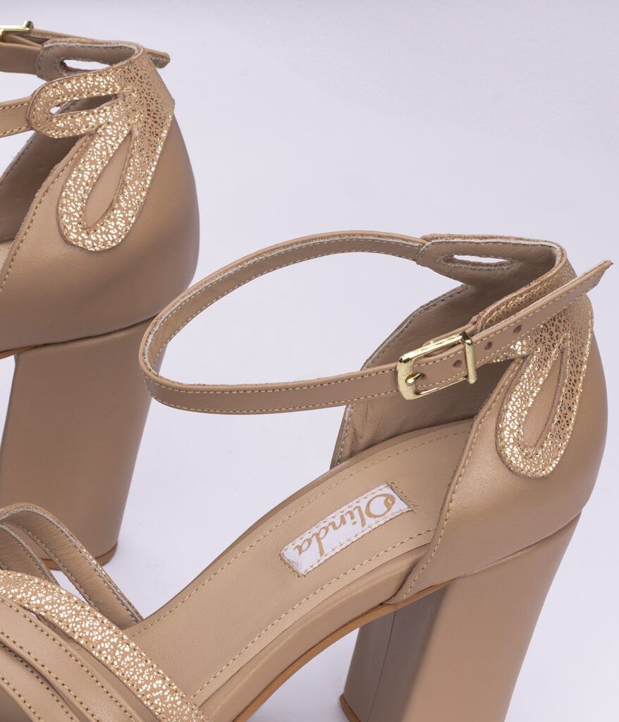 SANDALIA DE TACO 6 GRUESO CON CUERO MONACO NUDE COMBINADO CON TIRAS DE GLITTER COLOR CAMEL METALIZADO.