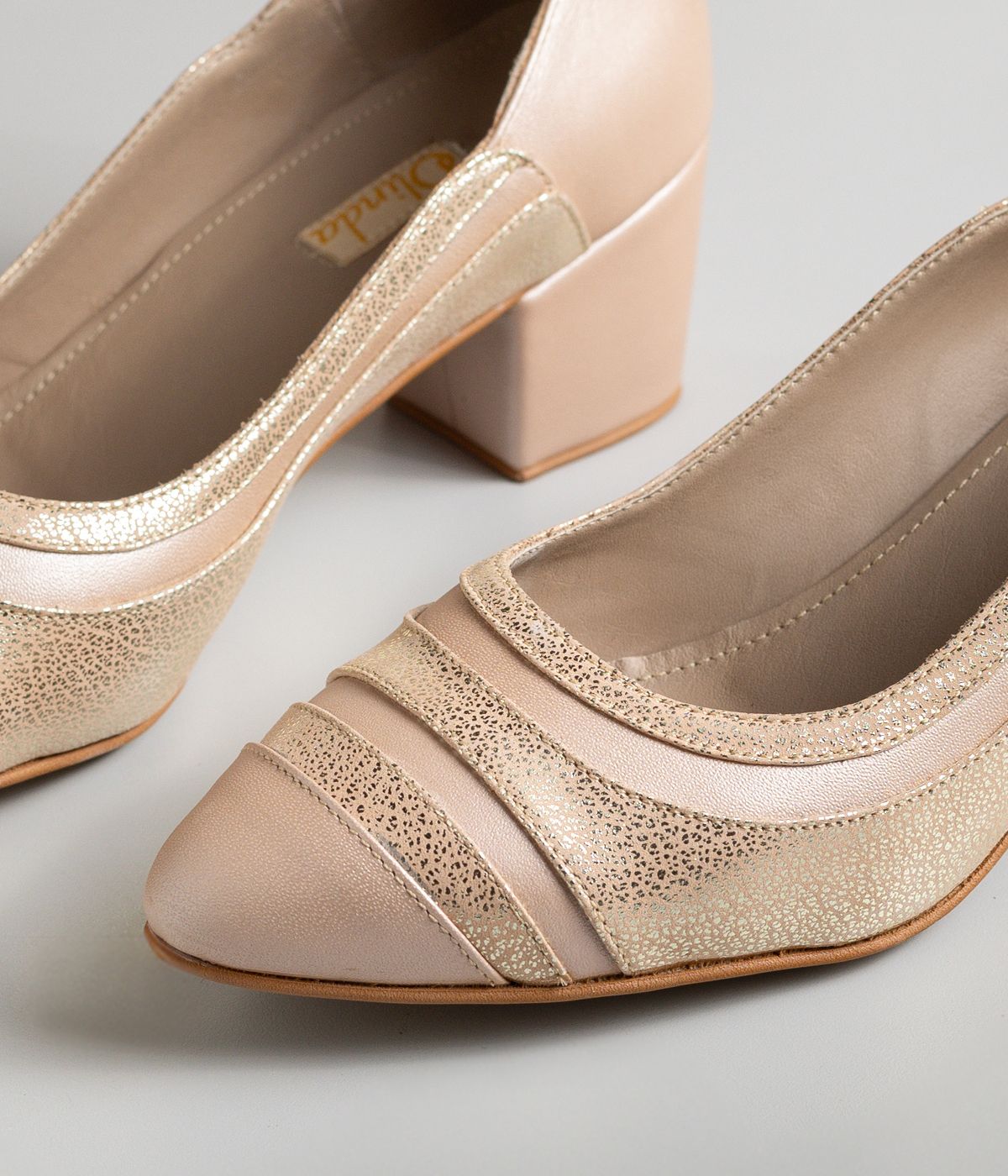 STILETTO EN CUERO PERLADO CHAMPAGNE COMBINADO CON MADONA NUDE PUNTA FINA Y TACO 4 GRUESO